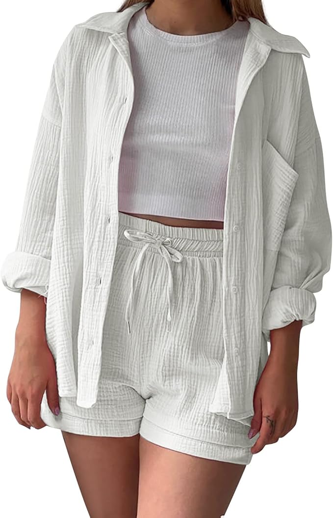 - Design : Ensemble deux pièces comprenant une chemise à manches longues avec poche poitrine et un short assorti avec taille élastiquée et cordon de serrage.