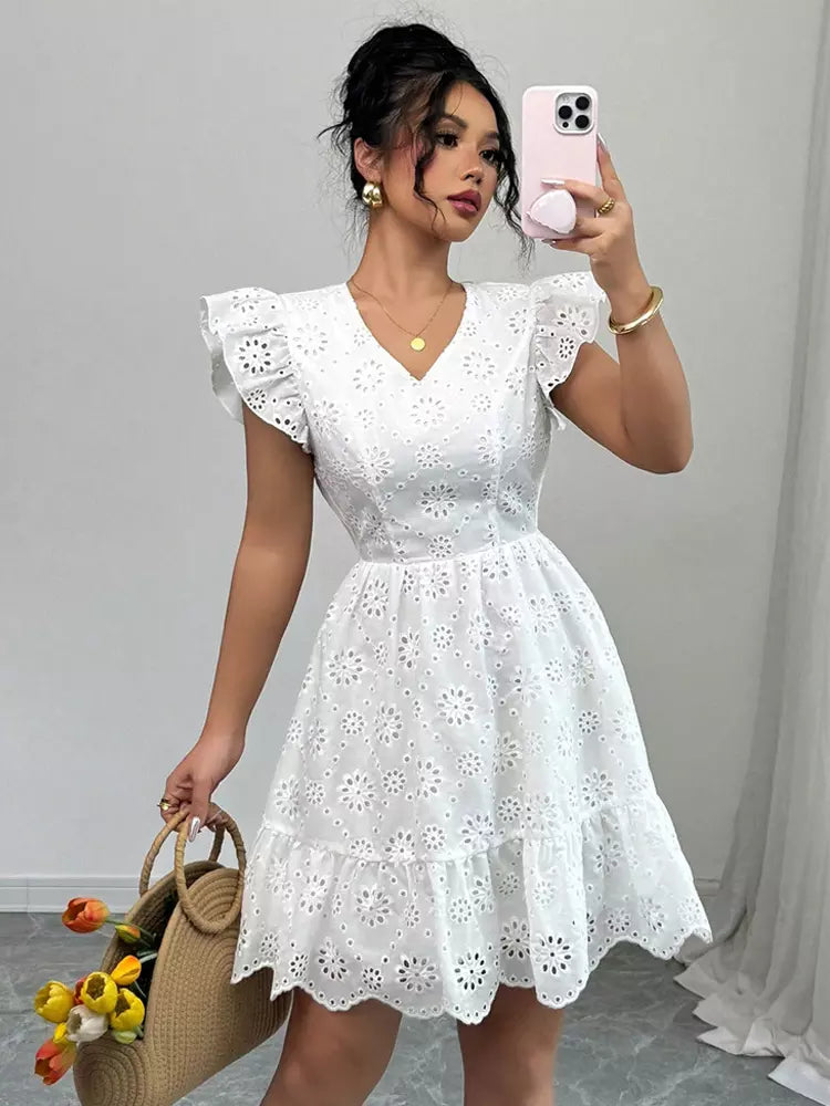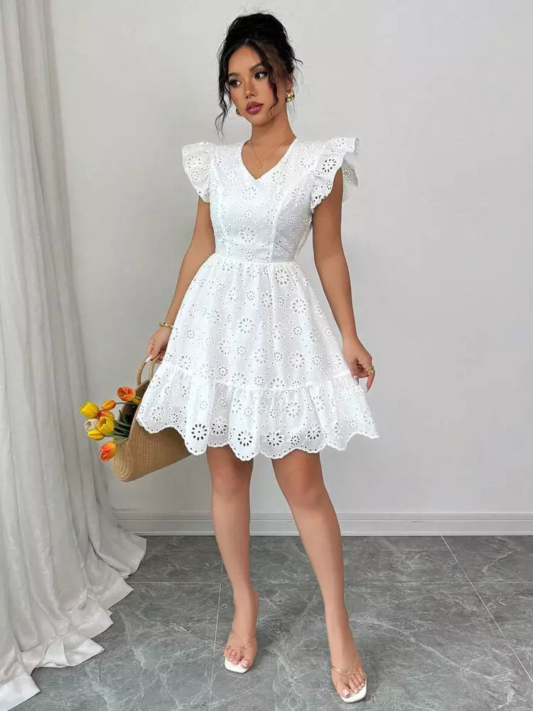 Enveloppez-vous de romance et de légèreté avec notre robe Céleste. Sa coupe délicate, sublimée par une broderie anglaise raffinée et des manches papillon aériennes, épouse votre silhouette avec une grâce infinie. Vous ne portez pas une simple robe, vous incarnez la douceur d'une parfaite journée d'été.