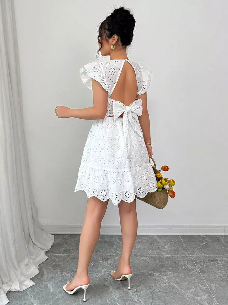 - Design : Col en V, manches papillon, taille cintrée, dos nu avec lien à nouer