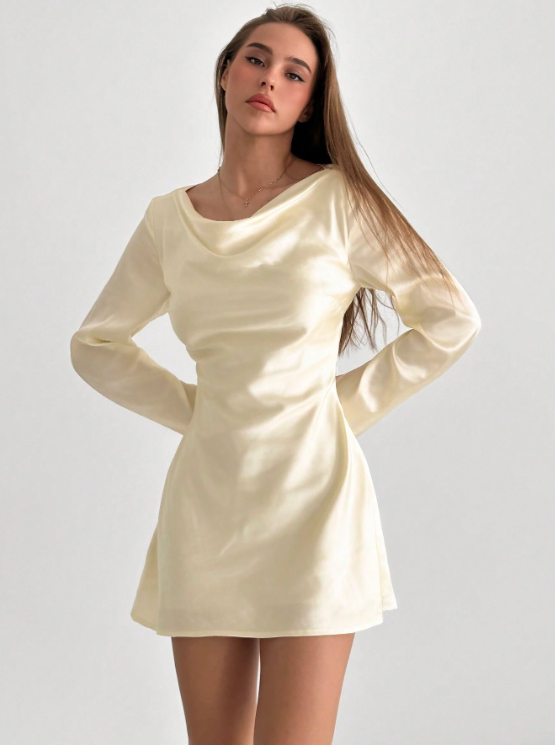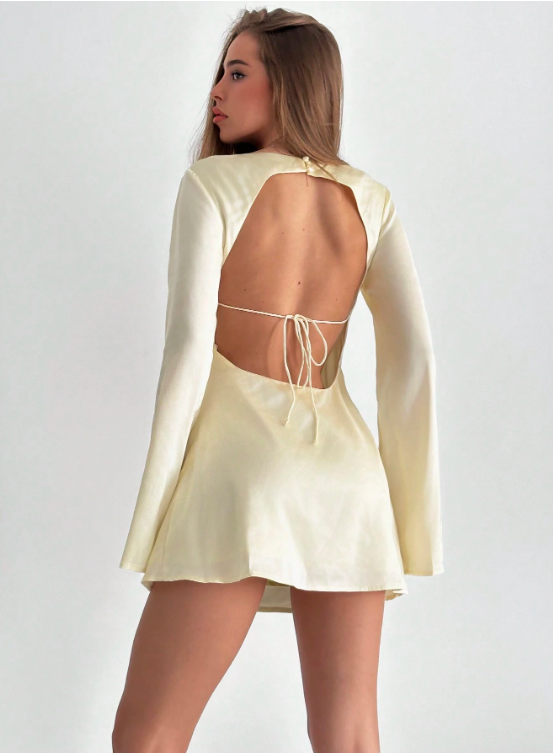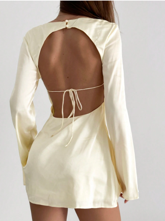 - Design : Col bénitier drapé, manches longues évasées, dos-nu avec liens à nouer pour un ajustement parfait, fermeture éclair latérale invisible.