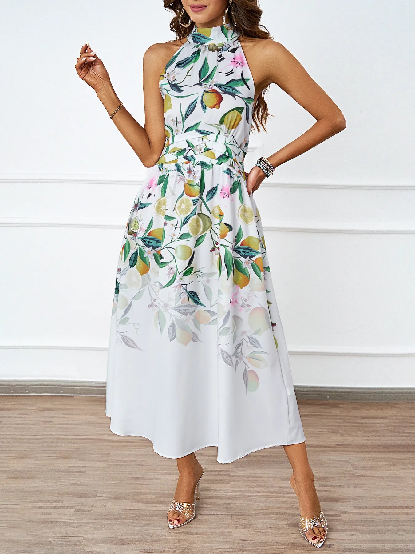 Laissez-vous transporter par une brise méditerranéenne avec cette pièce maîtresse de votre garde-robe estivale. Sa coupe halter flatteuse et son imprimé d'agrumes délicat dessinent une silhouette d'une féminité absolue, vous enveloppant de confort et d'élégance à chaque pas. Vous ne portez pas simplement une robe, vous rayonnez la douceur d'un été infini.