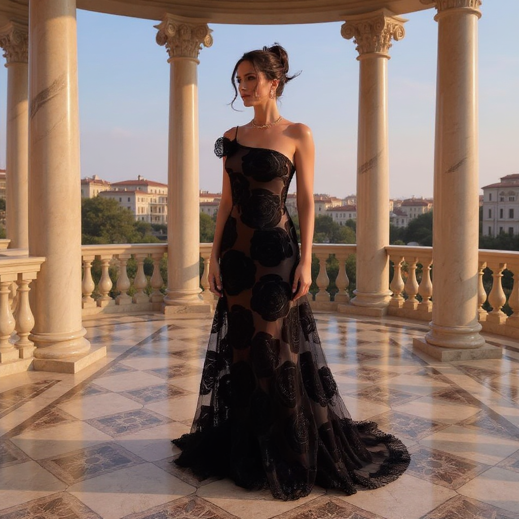 Dans cette création spectaculaire, vous ne marchez pas, vous rayonnez. Son voile audacieux, brodé de roses de velours ténébreuses, épouse et sculpte votre silhouette pour captiver tous les regards. C'est la pièce maîtresse des soirées inoubliables où vous êtes l'unique héroïne.